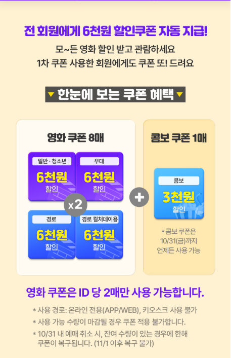 • 상영관 종류: 일반관 또는 특정 등급(2D, 일반관)만 해당; 프리미엄관, 특별관은 제외되는 경우도 있음